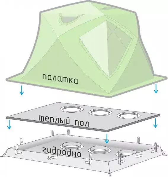 Утепленный пол, изготовленный из тканого материала, полностью накрывает своей поверхностью гидроизоляционное дно, изготовленное из весьма вредного для человека материала ПВХ (поливинилхлорид), тем самым обеспечивая внутри жилого помещения палатки экологически чистые условия. ПВХ остается с внешней стороны днища, надежно защищая укрытие от воды и механических повреждений.
