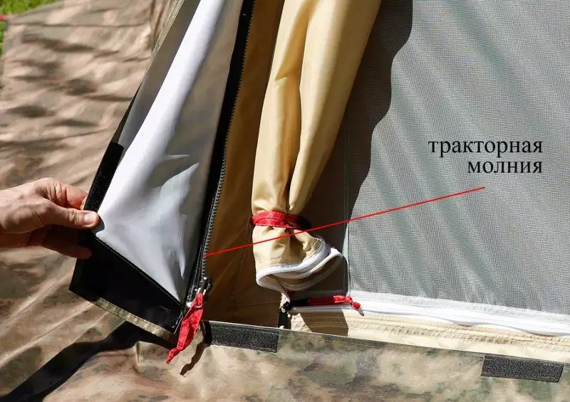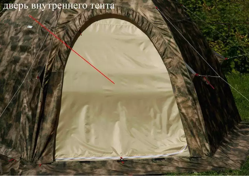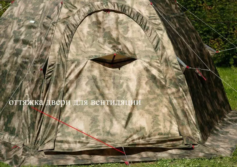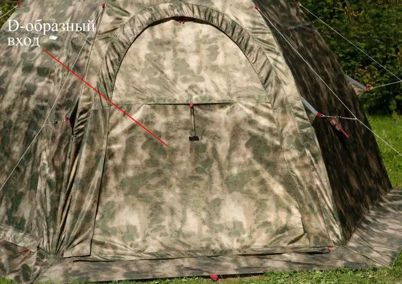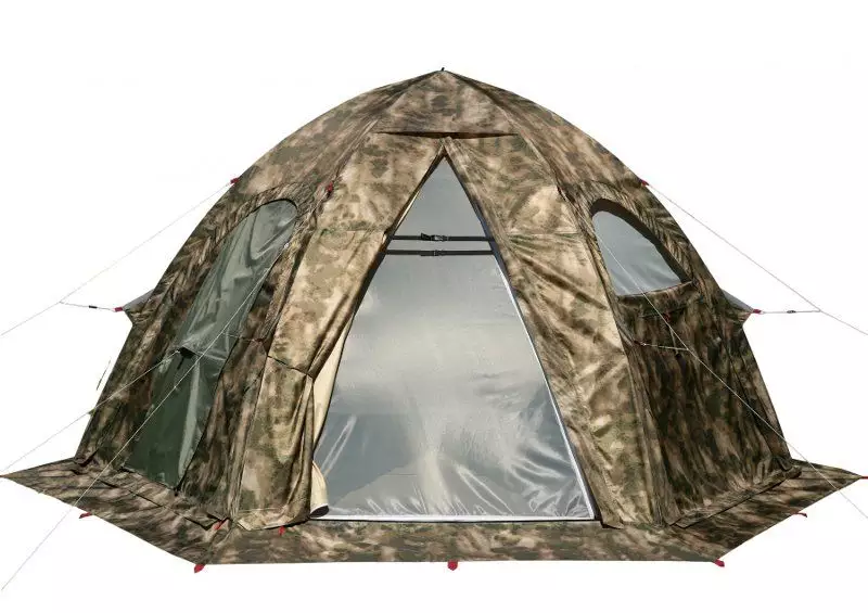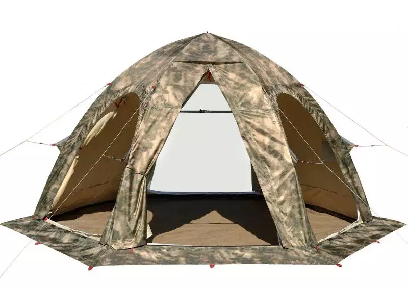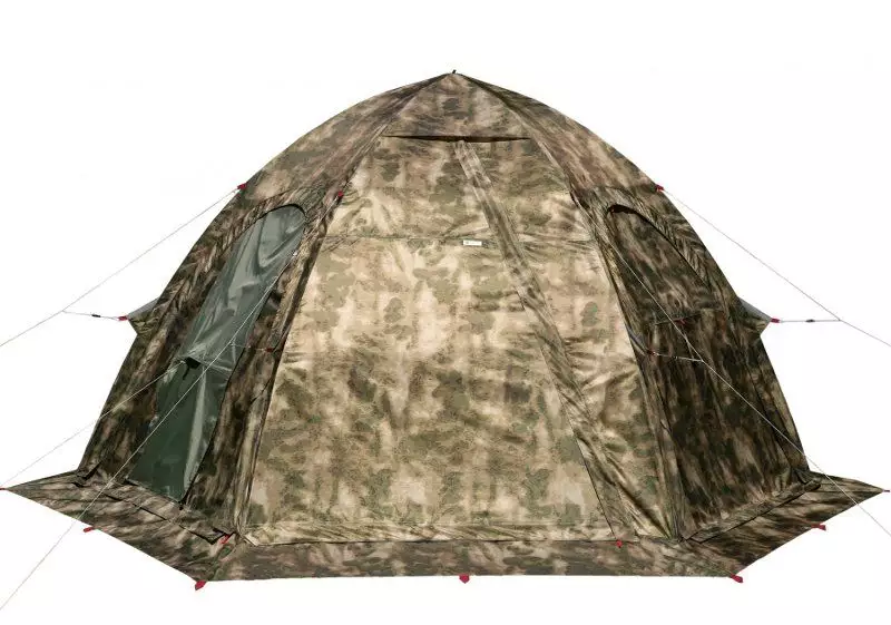 В базовом исполнении палатка состоит из двух самостоятельных слоев – внешнего и внутреннего тентов. Высокая гидроизоляция меж-тентового пространства, позволяет достичь высочайшей водонепроницаемости для жилого помещения палатки (не менее 10 000 мм. вод. столба). Четыре стенки шестигранной конструкции автоматической палатки оснащены входами с противомоскитными сетками и окнами с системами эффективной вентиляции. В одном из входов встроена универсальная двухслойная система установки отопительной печи, позволяющая установить в палатке печь любого типоразмера. Съемный влагостойкий пол входит в комплектацию и крепится к внутреннему тенту, обеспечивая всесезонному укрытию высочайшую герметизацию и защиту от насекомых.